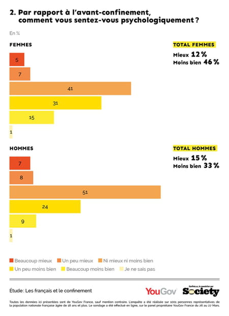 - Par ailleurs, les femmes sont plus nombreuses que les hommes à constater une dégradation de leur état psychologique (une femme sur deux dit se sentir moins bien contre un homme sur trois).