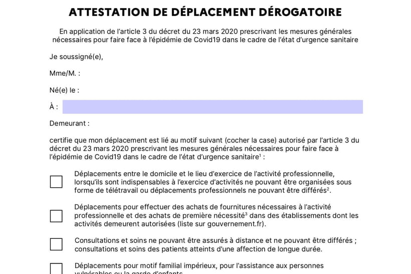 Depuis le 17 mars, 100 000 policiers et gendarmes ont été déployés sur tout le territoire pour contrôler les personnes qui circulent et qui doivent être en mesure de justifier leur déplacement avec une attestation de déplacement dérogatoire imprimée ICI et remplie au stylo indélébile et non pas au crayon à papier ou d'une attestation sur l'honneur écrite à la main sur papier libre, datée et signée.