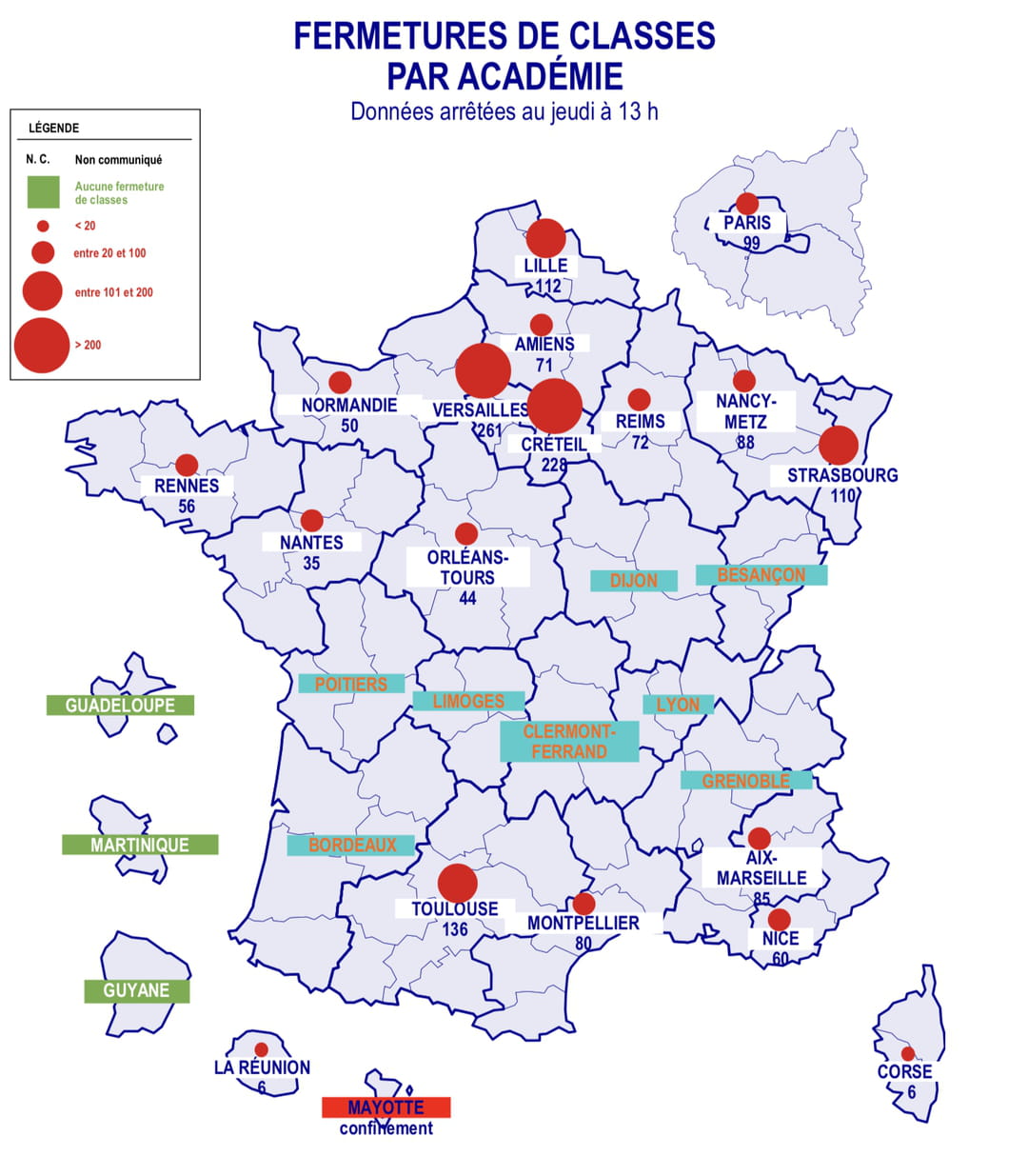 "Nous continuerons à fermer les classes des écoles, collèges et lycées au cas par cas, en lien avec les autorités de santé locales, chaque fois qu'un certain nombre de cas nous conduisent à cette décision" avait annoncé Jean-Michel Blanquer. Selon le ministère de l'Education nationale, à la date du 11 février à 13h alors que la zone A est en vacances, 103 structures scolaires (69 écoles, 26 collèges et 8 lycées) sont fermées ainsi que 1599 classes. Il précise également, dans un communiqué du 12 février, que 10 390 élèves ont été testés positifs au Covid-19 ces 7 derniers jours. Par ailleurs, 1 308 membres du personnel des établissements scolaires ont été testés positifs ces 7 derniers jours. Après la fin des vacances scolaires, le nombre de classes fermées au primaire, au collège ou au lycée devrait augmenter de façon importante car, depuis le durcissement du protocole sanitaire ce 1er février, elles seront fermées dès qu'un cas de contamination à un variant du coronavirus sera détecté. Ce qui change également, c'est qu'en maternelle, un seul cas de test positif au coronavirus, provenant d'un variant ou non, suffit désormais à fermer la classe.